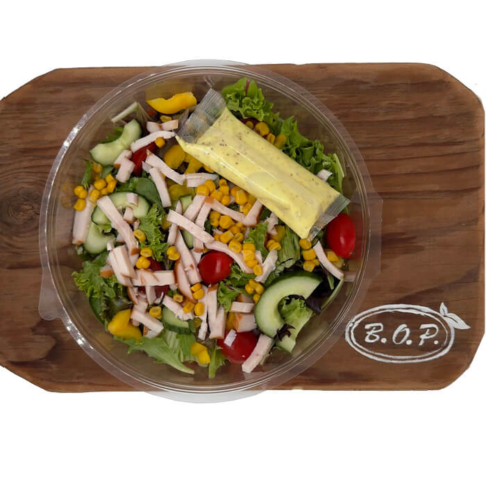 Taste a delicious salad with smoked chicken breast and honey-mustard dressing, served on a bed of mixed lettuce. The salad is supplemented with cucumber, bell pepper, corn and cherry tomatoes, and sprinkled with a sweet and spicy honey-mustard dressing. A simple and tasty meal for every day.